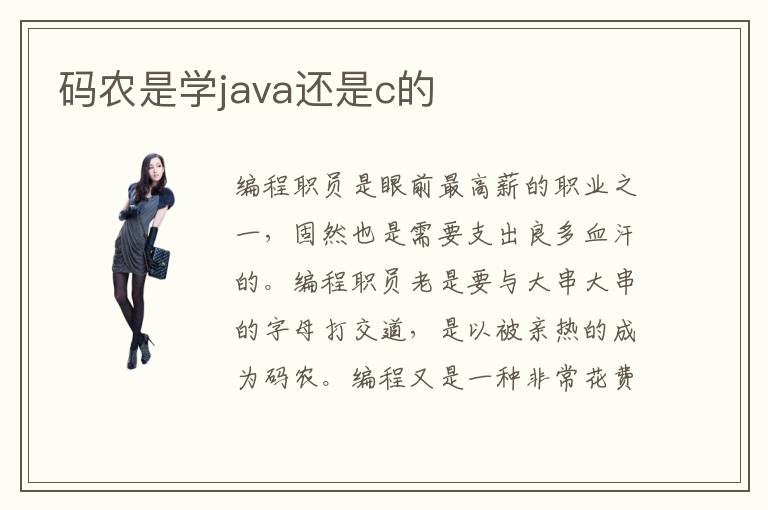 编程职员是眼前最高薪的职业之一,固然也是需要支出良多血汗的。编程职员老是要与大串大串的字母打交道,是以被亲热的成为码农。编程又是一种非常花费脑力的工作,需要精力上的高度集中,毫不许可犯一点毛病,不然想要在浩大的字母群体中找到毛病的闭键点,着实很坚苦,工程量是很复杂的。c语言和java语言都是此刻应用普遍的编程语言,码农是学java还是c的比较好呢码农是学java还是c的推荐电脑学校