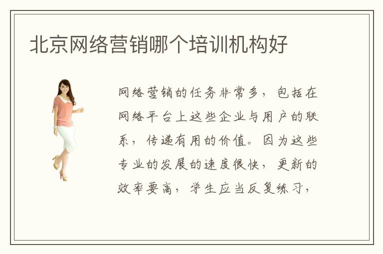 网络营销的任务非常多,包括在网络平台上这些企业与用户的联系,传递有用的价值。因为这些专业的发展的速度很快,更新的效率要高,学生应当反复练习,达到比较高的水平。如果学习进程比较难,可以报名网络营销指导班,完成重要训练,争取很好的进步。北京网络营销哪个培训机构好,学生应该分析这些辅导班的教学能力、教学效果、学生的口碑。许多学生就是因为应用能力不过关,所以才会报名辅导班,而网络营销辅导班的老师往往会结合大量应用的项目,使大家懂得更多应用的操作,完成各种复杂的任务。网络营销好找工作吗,网络营销是当下非常热门的专业,发展机遇很多,许多网络公司都需要这些专业的技术人才。学生毕业之后如果有很强的业务能力,找工作基本不会很多问题,