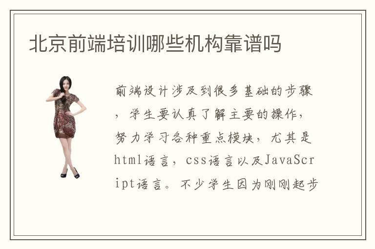 前端设计涉及到很多基础的步骤,学生要认真了解主要的操作,努力学习各种重点模块,尤其是html语言,css语言以及JavaScript语言。不少学生因为刚刚起步,应用能力不强,学习速度不够快,难免有很多压力,这时可以报名前端培训机构,由老师指定课程,提高学习效率。北京前端培训哪些机构靠谱吗,一般可以从培训的内容、培训速度、老师的水平等等方面出发。有些培训机构的老师懂得非常多,也在工作上有很优越的经验,可以手把手教学,让同学进步更快。前端培训班的学费大概在4000~8000,但具体收费因人而异,根据学生的课程和机构类型来决定。前端工程师需要做什么,前端工程师需要做的就是页面制作、网页布局,网络性能优化,分析不同编程在浏览器的兼容性。