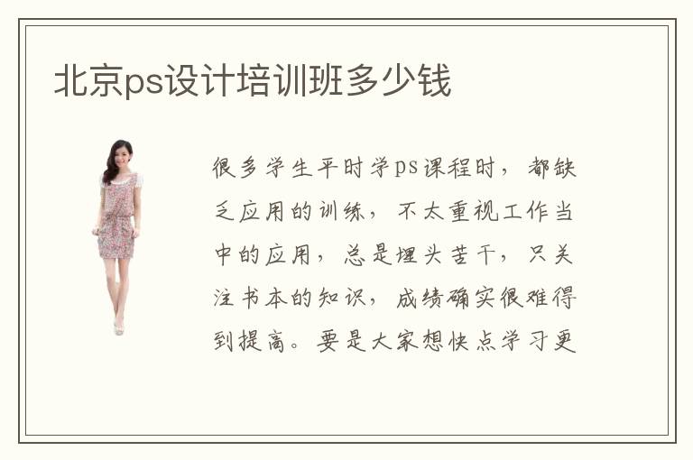 很多学生平时学ps课程时,都缺乏应用的训练,不太重视工作当中的应用,总是埋头苦干,只关注书本的知识,成绩确实很难得到提高。要是大家想快点学习更深层次的PS知识,可以报名辅导机构,由专业老师来训练,进步也许更快一点。北京报ps培训班要多少钱,可能是4000~9000,报名学校不同,学习的课程也不太一样,学习的费用有偏差。ps辅导班的速度很快,有些同学刚刚学习这些知识,只是停留在浅层认识,思路很不清晰,重点不够明确,但辅导老师会详细分析整体的知识结构,为总结介绍大量前沿的知识,同学很快就能抓住重点。ps的主要作用非常多,比如数据处理、图片处理、网页制作、技能设计、数码规划。大家可以根据个人的工作应用要求,选择合适的课程。