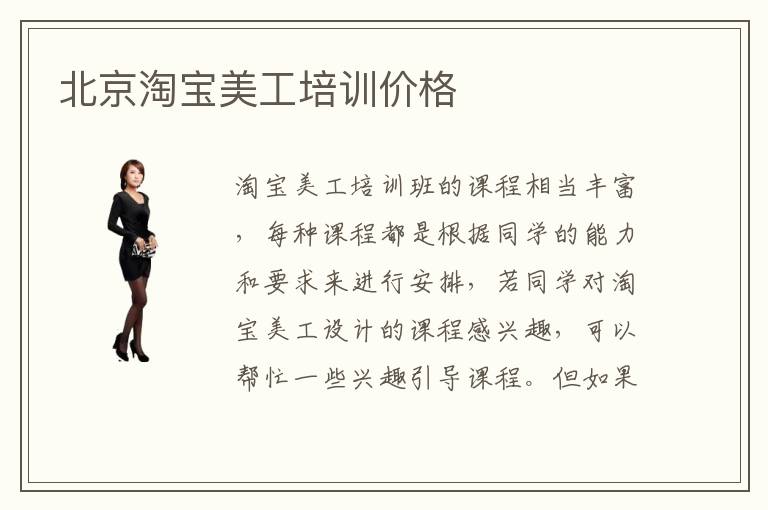 淘宝美工培训美工培训班的课程相当丰富,每种课程都是根据同学的能力和要求来进行安排,若同学对淘宝美工设计的课程感兴趣,可以帮忙一些兴趣引导课程。但如果想要在工作中有很多优势,可以选择一些应用辅导课和就业应用课,都会有很好的帮助。北京淘宝美工培训价格可能5000到1万元即可,因为学生报名的课程类型、报名的学校等等都不太一样,费用存在很多变化。其实有些同学会选择基础课程,原因是基础很薄弱,也没有系统的训练。而这些课程的难度比较低,而且学习时间较短,所以学习费用会更低。淘宝美工培训作用在于开拓学习思路,帮助同学掌握很多层面的知识。淘宝美工专业好不好找工作,淘宝美工专业找工作很简单,因为现在互联网需要大量的美工设计专员,学生可以好好把握机会。