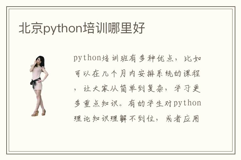 python培训班有多种优点,比如可以在几个月内安排系统的课程,让大家从简单到复杂,学习更多重点知识。有的学生对python理论知识理解不到位,或者应用能力不够强,很容易陷入困境,但选择某些专业的python辅导班后,成绩会有很大改进。北京python培训哪里好,大家的选择标准不同,很难去判断哪一个比较好。比如不少学生都希望短期内掌握python的知识,那么可以对比每个培训班的教学质量和培训速度。假如辅导班的python培训进度非常快,而且教学质量特别高,同学可以适当报名。python用处主要在于前端开发、数据库应用、操作系统安装。学生要想应用及这些内容,就应该要不断完善知识结构,掌握很多基础的课程,比如计算机算法、基本数据结构、编程、字符编码等等。