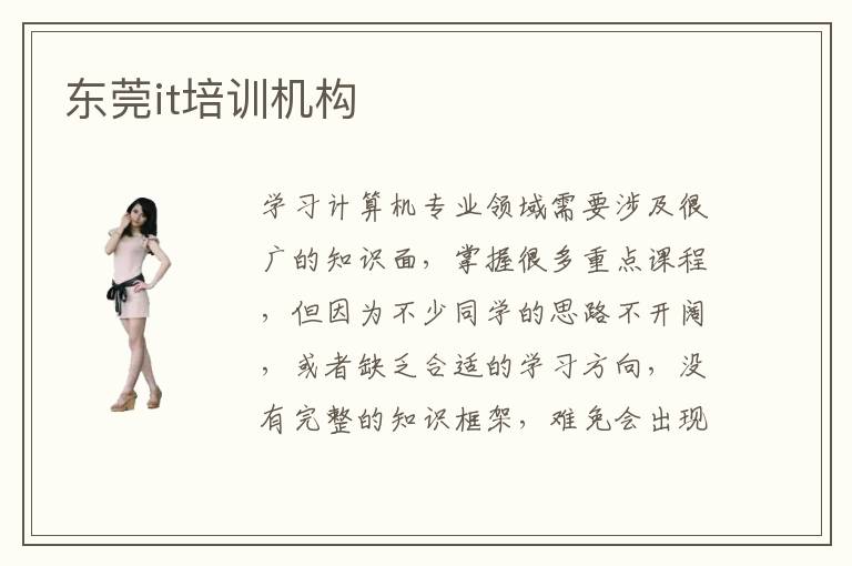 学习计算机专业领域需要涉及很广的知识面,掌握很多重点课程,但因为不少同学的思路不开阔,或者缺乏合适的学习方向,没有完整的知识框架,难免会出现很多知识漏洞,无法跟同行竞争。东莞it培训it培训机构可以手把手教学,每一位老师都会非常负责了解同学的就业现状和学习情况,然后再提供针对性的指导课程,这样同学不仅可以收获很多新颖的知识,而且对将来的学习也充满着信心。it培训机构上课方法比较多,比如1对1的课程,大班课程,小班课程,这些方法都十分有效,同学可以结合学习习惯,选择合适的上课方法。随着行业的快速发展,it工作难度也逐渐增大,所以同学要对自己有更严格的要求,努力接触一些新颖的知识,跟上时代的步伐,才能获得更多的进步。