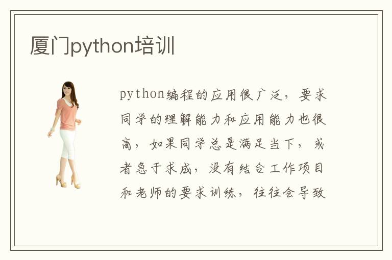 python编程的应用很广泛,要求同学的理解能力和应用能力也很高,如果同学总是满足当下,或者急于求成,没有结合工作项目和老师的要求训练,往往会导致知识漏洞特别多,难以进行弥补,后续的学习进程会变得很慢。厦门python培训学校的学习氛围很不错,而且同学们可以获得老师的1对1指导,往往有更强劲的动力,这样可以相互促进,相互提高。python培训有没有网上课程,python培训机构的网络课程其实很受欢迎,效果也比较好,因为有的同学经常时间不够用,很难抽时间到现场听课,而选择网络课程,情况就会得到改变。Python工程师的工资高吗,工程师的工资水平一般都不错,比如有些技术人员一个月下来可以拿到1万到2万的待遇。要是能力很强,经验很丰富,待遇还会更高。