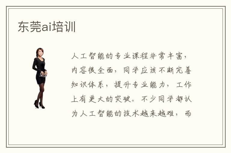 人工智能的专业课程非常丰富,内容很全面,同学应该不断完善知识体系,提升专业能力,工作上有更大的突破。不少同学都认为人工智能的技术越来越难,而且要求也越来多,不得不报名东莞ai培训课程。但是在学习的时候不能只依赖老师,还是要有自己的目标,然后整理自己的知识框架,争取在短期内获得突破,虽然有些技术很难,要求很严谨,但只要跟上老师步伐,一步步完善知识体系,都会有很大的进步。ai培训作用如何,多数培训班的作用都很明显,内容相当多,有利于改善同学的应用水平。而且老师在指导同学时会进行严格的分析,了解同学的能力,然后制定一些趣味性的课程,使学员都能够沉浸其中。ai主要的工作任务是什么,主要任务就是程序开发、数据分析、机器学习等等前沿的技术。