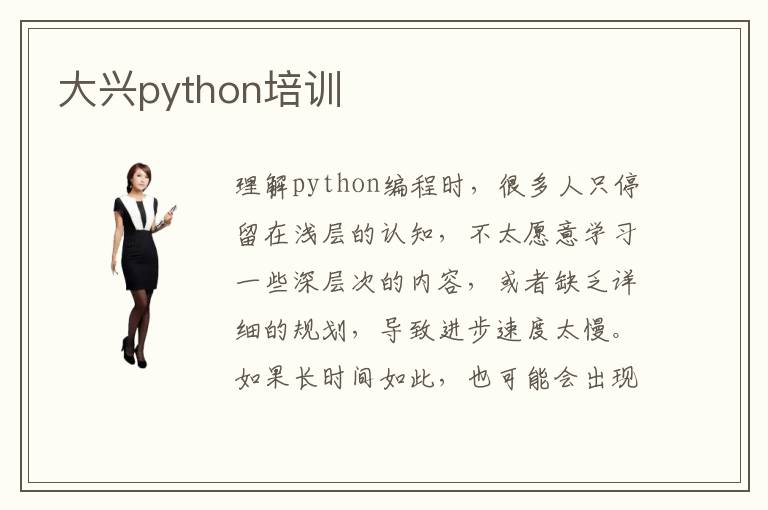 理解python编程时,很多人只停留在浅层的认知,不太愿意学习一些深层次的内容,或者缺乏详细的规划,导致进步速度太慢。如果长时间如此,也可能会出现精神状态不佳等问题。有的同学已经意识到自己的问题,所以报名专业的培训班,得到更多指导,快速解决现有的疑惑。大兴python培训学校会解决应用的难题,将理论和实践紧密结合在一起,帮助同学开拓学习的思维,掌握学习重点,争取在短期内获得突破。python培训报名费多少,可能在3300~8800元,但这只是一个大概范围,没有标准的答案,因为有的同学报名的课程很难,学习时间比较长,所以费用会上升。有部分同学报名一些浅层的课程,课程比较简单,学费可能会比较低。python培训有哪些应用,主要应用有软件设计、网络开发、计算机程序等等。