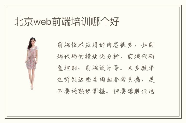 前端技术应用的内容很多,如前端代码的模块化分析,前端代码量控制,前端设计等。大多数学生听到这些名词就非常头痛,更不要说熟练掌握。但要想胜任这些领域的工作,就不能够畏惧,也不要常常躲避,还是要正面应对各种学习的挑战。北京web前端培训web前端培训哪个好,其实很多专业机构都会详细介绍web前端设计的知识,并且有非常好的教学节奏,由浅入深,系统化训练,使得大家在毕业之后能熟练使用html基本标签和自定义插件等知识。web前端培训哪些比较好,若想挑选口碑很好的前端培训机构,可以到当地的院校走一走,了解已报名学生的评价,有的学生满意,自然会对这些机构有正面的评价。web前端辅导费用高不高,大概范围是3600元到18000元,基础性的课程难度低,费用也相对下降。