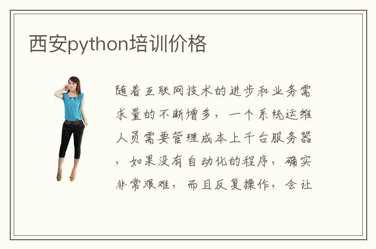 随着互联网技术的进步和业务需求量的不断增多,一个系统运维人员需要管理成本上千台服务器,如果没有自动化的程序,确实非常艰难,而且反复操作,会让技术员的工作量迅速增多。通过Python编程就能够设计自动化的运维软件,使得整一个运维管理工作更简单,并且准确度大大得到提升,让运维人员从管理服务器的繁琐劳动中解放出来。西安python培训价格大概在7000~24000元,因为大家报名的辅导机构的师资力量和口碑,配套设施等不同,会直接影响学校的收费标准。不过大家可以看看这些机构的评价,了解已经参加过辅导班的同学,看看这些机构到底有哪些好处,这样才能够做好判断。python培训师资力量一般很强,老师没有扎实的基本功,培训能力非常突出,每种课程都有口皆碑。python花多久学习,入门知识要学两三个月,高阶的课程可能要三个月到半年。