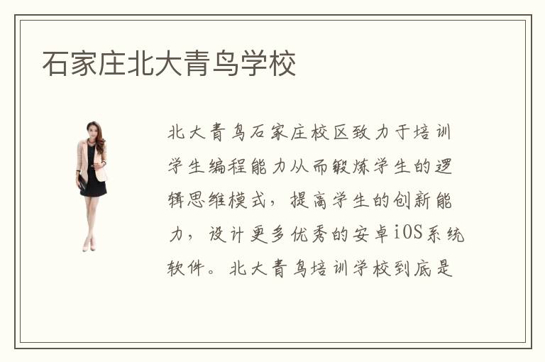 北大青鸟石家庄校区致力于培训学生编程能力从而锻炼学生的逻辑思维模式,提高学生的创新能力,设计更多优秀的安卓iOS系统软件。北大青鸟培训学校到底是一所什么样的专业性公司。石家庄北大青鸟北大青鸟学费培养人才方面的经验特别多。石家庄北大青鸟怎么样作为一所北大青鸟职业培训机构,这几年来为社会培养了非常多的北大青鸟人才。首先,石家庄北大青鸟为了扩展更大的就业渠道,保障学院就业,与全国当地以及全国范围非常多企业建立了长期的人才储备和输送协议,为毕业生就业开辟了道路。而且,北大青鸟作为全国一流的it培训学校,其资历是非常老的,教学水平也是相当的高。石家庄北大青鸟你的教学设备特别齐全,做到了学生们一人一台。另外来说说石家庄北大青鸟师资力量,在师资力量配备上,北大青鸟依托北大的资源,并且在教师的选拔上,都是研究生以上学历,从事项目5年以上经验丰富的,拿到相关专业证书的,有授课允许的,每一段时间都有对应的教师考核机制,因此淘汰率非常高。