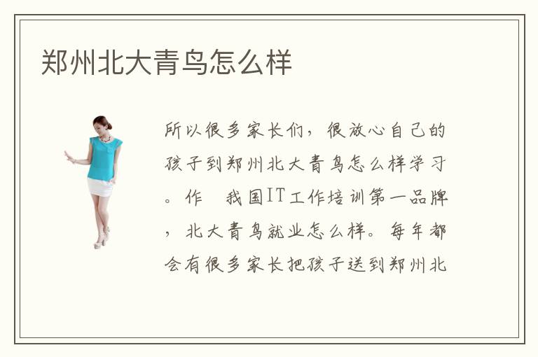 所以很多家长们,很放心自己的孩子到郑州北大青鸟怎么样学习。作爲我国IT工作培训第一品牌,北大青鸟就业怎么样。每年都会有很多家长把孩子送到郑州北大青鸟学校进行学习,这家长对郑州北大青鸟学校都特别放心,十分的信赖。这里总结了郑州电脑培训学校各自的综合能力,方便您的选择。北大青鸟郑州分校教育水平怎么样。这里推荐郑州北大青鸟学校,这是一所专门的北大青鸟培训学校,里面开设有许多北大青鸟专业的培训班,培训学校办学十多年来,毕业学生可谓桃李满天下,学校为社会和北大青鸟事业做了很大的贡献。其中最有代表性的学校就是郑州北大青鸟怎么样。郑州北大青鸟环境优美交通方便周围安静适合学习提升自己。而郑州北大青鸟环境还是非常不错的,四周特别的优美,而且寂静很适合学生们学习。