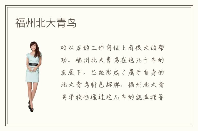 对以后的工作岗位上有很大的帮助。福州北大青鸟在这几十年的发展下,已经形成了属于自身的北大青鸟特色招牌。福州北大青鸟学校也通过这几年的就业指导,使得毕业生的就业情况得到很好的解决,目前一些优秀的毕业生也找到了非常不错的工作,在各大著名企业就职,例如北大方正,联想公司,中软,华为,TCL等大型互联网公司。福州北大青鸟位安徽省首府福州,所处地域优势在于人口众多,经济发展相对繁荣,城市资源设备相对完善,福州北大青鸟依托当地的地域优势和总部给予的教育技术的支持,这几年的办学成果良好,吸引了众多学子前来就学,福州北大青鸟学费一般在18000-20000之间,各专业之间存在偏差,由于地域和资源的不同,北大青鸟各城市分校区的学费也是不一样的,但是在收费上,该机构透明办公,制度公正的基础,不存在乱收费现象。