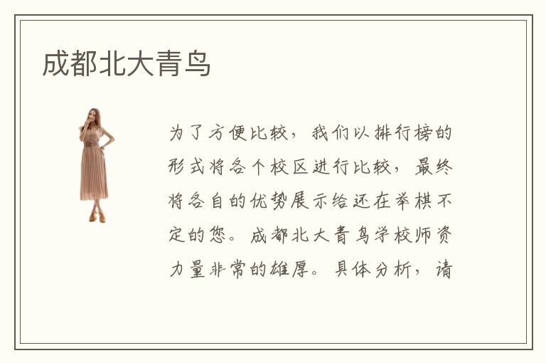 为了方便比较,我们以排行榜的形式将各个校区进行比较,最终将各自的优势展示给还在举棋不定的您。成都北大青鸟学校师资力量非常的雄厚。具体分析,请等待揭晓。在这个全民都在学习的时代,只想学一门专业技术,就来成都北大青鸟学校学习。许多对计算机相关领域感兴趣的人都会或多或少的了解成都北大青鸟怎么样,成都北大青鸟怎么样也因此吸引了众多对北大青鸟感兴趣的同学前去学习。在成都北大青鸟毕业的学生在自己的工作上面都有所成就,他们至今都很感激成都北大青鸟因为成都北大青鸟给了自己学习专业知识莫大的帮助。成都位于中国的南部地区,换种方法来描述,中国的版图比作一只鸡,那么成都大致位于鸡胸脯的位置。成都,是秦朝的首府,在西汉时有富冠海内,天下名都之称,地理位置甚为重要。