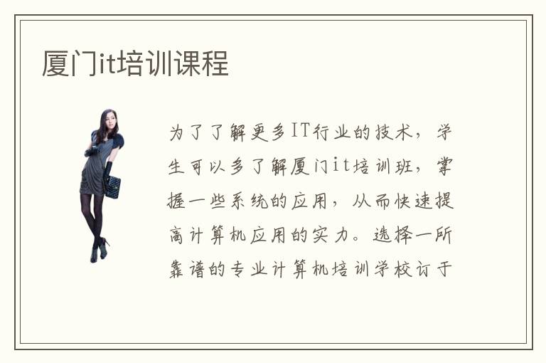 为了了解更多IT行业的技术,学生可以多了解厦门it培训班,掌握一些系统的应用,从而快速提高计算机应用的实力。选择一所靠谱的专业计算机培训学校订于此后的计算机相干专业课程学习结果会发生很大的影响,那末厦门靠谱的计算机it培训机构有哪些呢。所以,到厦门学习it技术是快速掌握it技术的方法。对于业余计算机爱好者来说,想要正式成为一名合格的IT,单有过硬的技术是不够的,你可能需要通过国家计算机标准考试,所以一定要找一家厦门IT培训学校上课学习,因为厦门IT培训学校的专业就是辅助学生通过相关考试,对于这方面的内容,人家的见解还是比较深刻的。但不管学习哪一门课程,大家还是要从简单的开始,不要一上来就想要学习复杂的知识,尤其是电脑培训课程,往往就是深入浅出才能看到效果。