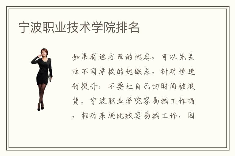 如果有这方面的忧虑,可以先关注不同学校的优缺点,针对性进行提升,不要让自己的时间被浪费。宁波职业学院容易找工作吗,相对来说比较容易找工作,因为很多学校都会开设一些比较热门的专业,而且老师也会针对不同的学生适当培养,从而提升就业的机会。有些学生发现自己的中考或者是高考的学习成绩非常一般,因此不打算进一步深入学习,想要到职业学院进修,掌握自己的专业技能,在未来的发展道路上可以找到更好的工作。好比宁波职业学校,那末,宁波职业学校的学习空气怎么样呢。宁波职业学院有排名吗,大多数职业学院并没有排名,如果要找好的学校,还是要多关注学生的口碑情况,有条件的情况下可到实地考察一下,了解专业的情况以及学生的评价,相信会有非常不错的收获。