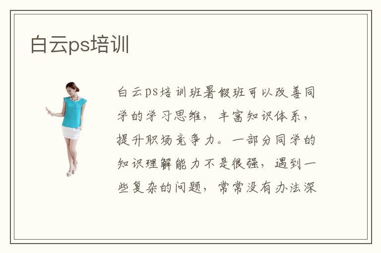 白云ps培训班暑假班可以改善同学的学习思维,丰富知识体系,提升职场竞争力。一部分同学的知识理解能力不是很强,遇到一些复杂的问题,常常没有办法深入进行思考,也没有办法掌握其中的应用要求,而辅导老师可以详细介绍ps软件的作用,也会安排多种课程规划,使大家充分发挥自身的优势,弥补专业方面的不足,迅速改善工作运用的能力。如果同学想拥有较大的突破,都可以报名白云ps制图培训学校,这些学校的技术水平非常高,培训的方案也非常丰富,同学从中可以得到非常多应用的经验。虽然看似比较普通,但是得到很多重要的知识,大家要多加练习,得到更好的专业进步,从而在工作上得到很好的机会。白云ps专业培训学校一般都有系统的教学内容,ps专业培训学校可不可靠,培训班当然非常可靠,很多学校的专业能力都特别强,有利于培养同学的专业素质,也能增强应用的水平。