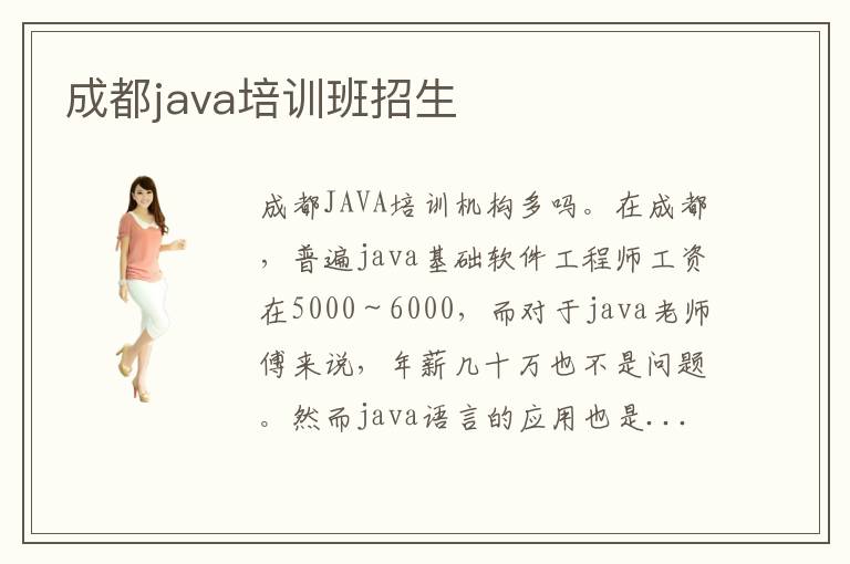 成都JAVA培训机构多吗。在成都,普遍java基础软件工程师工资在5000~6000,而对于java老师傅来说,年薪几十万也不是问题。然而java语言的应用也是非常广泛的,例如现在各种手机软件的开发设计、网页网站的脚本编码等等方面,因此学好java语言编程设计对于今后的就业也是一大保障。Java编程设计师是一个不论什么时代都不会淘汰的工作职业,随着社会的信息化突破也使得Java设计工作市场开拓起来,对于Java设计人才的需求也是与日俱增,因此也就有了成都Java培训班的成立。如果你想要越好java技术,就到成都java培训机构学习。你们,在成都这个地域,各大企业关于java人材的需求量也是很大的。