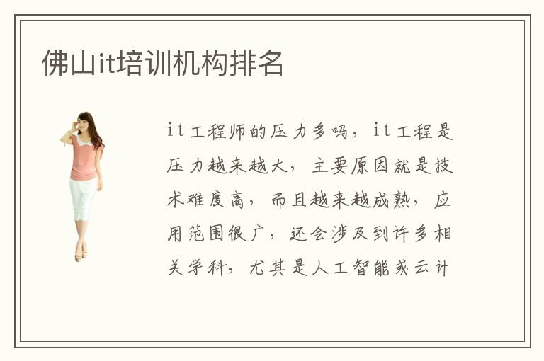 it工程师的压力多吗,it工程是压力越来越大,主要原因就是技术难度高,而且越来越成熟,应用范围很广,还会涉及到许多相关学科,尤其是人工智能或云计算。佛山最好的IT学校是哪家。it培训机构哪些好,选择It培训班的时候,应该看一下教学方式,培训质量以及授课的类型等。佛山IT培训学校老师水平比较高,一般都有丰富的经验,能够应对多种教学当中的问题,另外老师能一对一进行实践的培养,为学生提供大量健康的就业理念,学生在未来的道路上,既能够提升实践能力,又可以发挥更强的专业优势,成长为一个具有全方位发展的综合性人才。首先要挑选出品牌、口碑都比较好的专业培训机构,这些培训机构不管师资还是本身办理经历上都有很大上风。