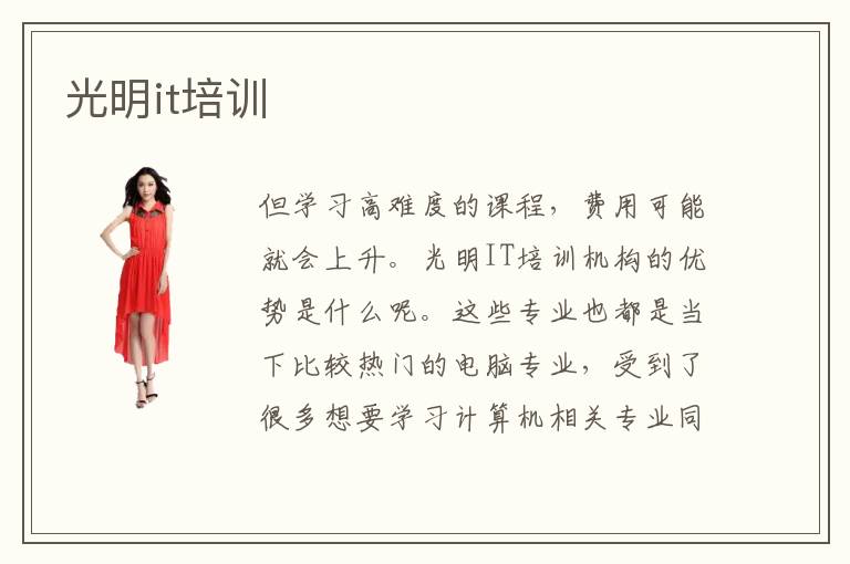 但学习高难度的课程,费用可能就会上升。光明IT培训机构的优势是什么呢。这些专业也都是当下比较热门的电脑专业,受到了很多想要学习计算机相关专业同学的喜爱。光明计算机培训机构排名具有科学性和可靠性,通过我们不断地筛选,越来越多优质的计算机培训学校被发现被挖掘。既然是it培训学校,开设的课程都是当下最热门的新兴互联网专业,包括java编程、php数据以及html5网站设计等等,每年都有大批前来学习的学员报名参与。目前来说,计算机专业是国内火热的项目职业,发展可能性很好。这时可以先对比各种辅导班,看看光明it培训怎么样。计算机IT培训容易吗。跟着寰球信息化趋向的大好成长趋向,各行各业关于计算机相干专业技术型人材的需求量也在稳步挑升,这一近况也就申明了计算机IT行业在国内存在广漠的成长前景。