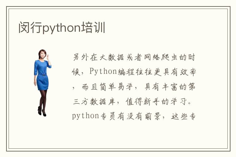 另外在大数据或者网络爬虫的时候,Python编程往往更具有效率,而且简单易学,具有丰富的第三方数据库,值得新手的学习。python专员有没有前景,这些专业领域前景很好,大家可以找到较为满意的工作,而且由于人才缺口很大,发展空间也比较开阔。python培训师资水准特别强老师一般都有很多年的技术辅导经验,了解学生存在的学习疑问,通过针对性的教学案例让大家更快理解这些教程的讲解内容。python培训班小班教学有很多优点,首先就是可以培养同学的信心,结合同学的应用能力去尝试多种课程,有些同学的经验不够多,或者应用能力不够强,但是报名辅导班之后,情况就会逐渐好转,有利于挖掘更多新的技术领域。为了迅速改善,同学不妨看看闵行python培训机构有哪些,请教python辅导机构的老师,老师的教学水准高,课程也十分严格,确保同学能达到要求。