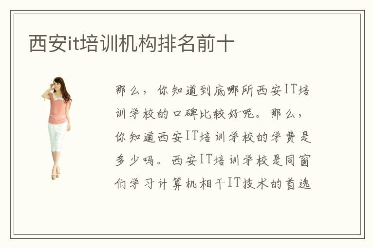 那么,你知道到底哪所西安IT培训学校的口碑比较好呢。那么,你知道西安IT培训学校的学费是多少吗。西安IT培训学校是同窗们学习计算机相干IT技术的首选平台,就师资团队而言西安IT培训学校具有国内顶尖的计算机培训团队,请教学品质而言西安IT培训学校开设了丰硕的专业课程,而且按照市场成长做出关理的调剂,最大化分保证了学生们的就业困难。乐趣是学习计算机专业最有效的能源,西安IT培训学校开设了良多当下热门的计算机专业课程,学生们可以遴选他们感乐趣的课程停止报论理学习。只要充实领会了西安IT培训学校的排名挨次,能力在浩繁西安IT培训学校当选择出最合适本身去学习的西安IT培训学校。仅仅靠个人的努力是不能够完成的,选择一所比较靠谱的计算机专业培训学校,是学好计算机相关专业最重要的一步。