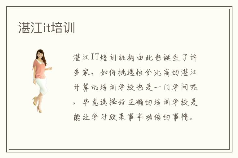 湛江IT培训机构由此也诞生了许多家,如何挑选性价比高的湛江计算机培训学校也是一门学问呢,毕竟选择好正确的培训学校是能让学习效果事半功倍的事情。主要为实现青年一代的IT梦提供一个崭新的平台。湛江it培训机构在学员掌握基础知识以后,让学生逐步参与各大项目的开发设计,让学生掌握更多经验知识。很多同学在学习软件开发或者网络优化等课程时都会茫然,原因在于没有老师指点,缺乏严谨的训练,遇到难题也无法通过自己的方法理解。湛江北大青鸟IT培训学校专注于培养一流的计算机专业工程师,为国内的计算机行业送去一批又一批的高端it技术型人才。湛江有哪些比较靠谱的专业IT培训学校呢。湛江IT培训学校的收费标准是按照学生们选择的课程来决议的,分歧的课程有分歧的价位。