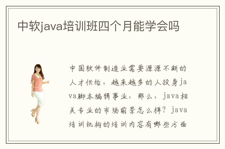 中国软件制造业需要源源不断的人才供给,越来越多的人投身java脚本编辑事业,那么,java相关专业的市场前景怎么样?java培训机构的培训内容有哪些方面?java培训机构教员专业水准好吗?中软java培训班四个月能学会吗?如果在中软java培训班进行四个月的学习,学习效果怎么样呢?中软java培训机构学习多长时间才能有所成效?中软JAVA培训班学习情况。