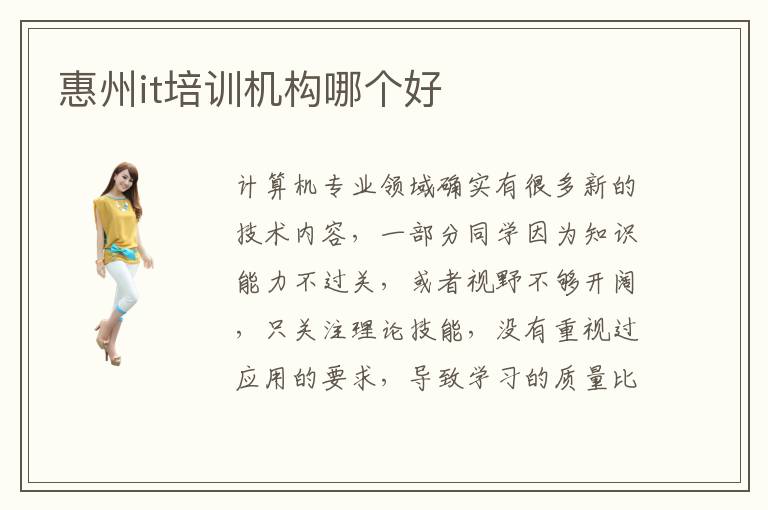 计算机专业领域确实有很多新的技术内容,一部分同学因为知识能力不过关,或者视野不够开阔,只关注理论技能,没有重视过应用的要求,导致学习的质量比较低,成绩一直都不是很好。优势惠州IT培训多少钱,大概的费用可能在3000元到9000元不等,但是也有部分机构的水平不同,教学的效率不是那么高,学习的氛围不够浓厚,学习的费用就会下降。有一些同学学习计算机专业时,没有任何方向,学习过程对自己的要求不高,缺乏应用训练,达不到工作要求,导致应聘的时候会存在非常大的难题。一些同学在学习计算机知识的过程中,发现精神压力越来越大,周围的同学越厉害,但自己却原地踏步,会影响学习节奏和学习状态。惠州it培训机构哪家好,这个并不是固定不变,主要就是选择标准不同,比如有的学校更关注理论训练,还有一些学校非常擅长应用教学。