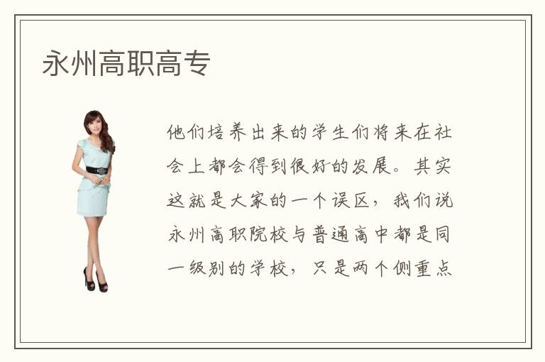 他们培养出来的学生们将来在社会上都会得到很好的发展。其实这就是大家的一个误区,我们说永州高职院校与普通高中都是同一级别的学校,只是两个侧重点不同,一个是文化教育,一个是职业技能的培训。永州高职院校费用大概是3000到5万元,其实有非常多影响因素,包括老师水平,以及教学环境,配套设施等等,不同的学校往往收费标准都是不一样的,但大多数情况下都很不错的教学成果。每年这些高职院校都会招聘很多专业人才教师对学生们授课,这样学生们学到的一些知识都是非常专业的知识。家长们和学生们关于高职技术培训学校存在的成见还是很大的,看到了良多闭于高职院校学生不求长进的动静,大都人从客观认识就以为高职技术培训学校的讲授专业性不强,是以在专业课程的学习结果方面天然就不克到达预期的抱负。