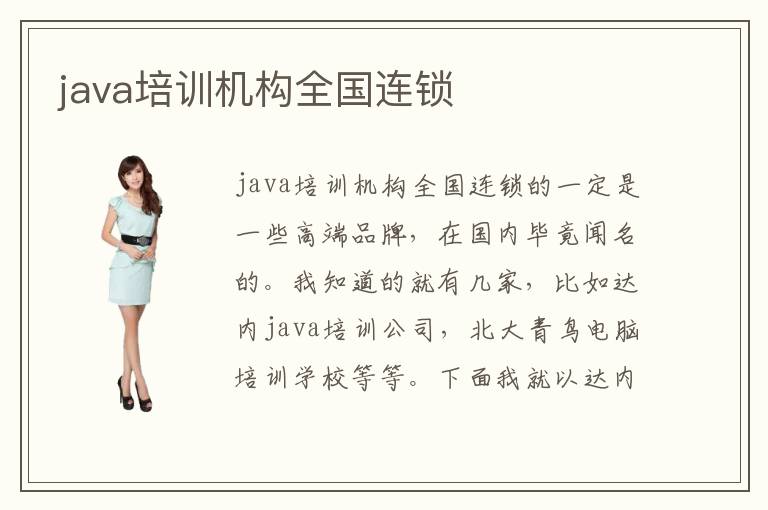 java培训机构全国连锁的一定是一些高端品牌,在国内毕竟闻名的。我知道的就有几家,比如达内java培训公司,北大青鸟电脑培训电脑培训学校等等。下面我就以达内java培训公司为例子,给大家讲解一下达内的相关信息吧。达内作为国内知名的java培训机构,在全国开设了一百多家分公司,培养了大批优秀的java设计工程师。师资一流,教学一流,就业一流等均为达内赢得了好口碑。