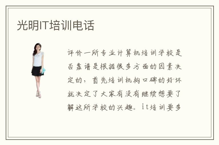 评价一所专业计算机培训学校是否靠谱是根据很多方面的因素决定的,首先培训机构口碑的好坏就决定了大家有没有继续想要了解这所学校的兴趣。it培训要多久,培训班的课程一般是一个月到三个月,当然也有一些同学的基础很差,打算从零开始学起,这时可能要半年左右的时间。那么,你知道光明IT培训学校到底哪家的教学方式比较适合你吗。it技术有点复杂,许多同学没有办法通过自己的能力理解,也不知道如何改善应用能力,所以会有相当多的学习障碍,实力也会越来越糟糕。这就需要学生擦亮眼睛,在鱼龙混杂的光明IT培训学校中发现高品质的一家,然后对光明IT培训机构进行选择。光明IT培训学校并没有花费过多的时间、精力以及财力进行对于自己企业的包装宣传,更注重的是对于自身教学课程以及教学质量的提升,是用自己的实际教学能力来证明自己好口碑的。