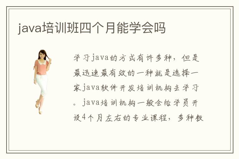 学习java的方式有许多种,但是最迅速最有效的一种就是选择一家java软件开发培训机构去学习。java培训机构一般会给学员开设4个月左右的专业课程,多种教学方案,因材施教。四个月的时间说长不长,说短也不短,那么究竟java培训班四个月能学会吗?不同的java培训机构会造成不同的学习效果,选择的时候需要大家谨慎一些,从多方面考察学校。