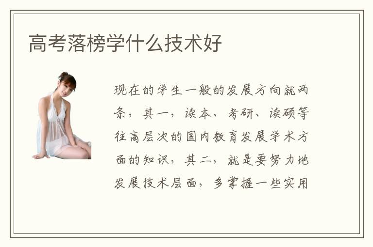 现在的学生一般的发展方向就两条,其一,读本、考研、读硕等往高层次的国内教育发展学术方面的知识,其二,就是要努力地发展技术层面,多掌握一些实用性的技能,朝就业方向发展。高考落榜学什么学什么技术好?高考落榜生在思考要学什么技术的时候可以参考一下时代的发展变化以及未来可能的发展趋势,及时做好准备。高考落榜生大专职业技术培训内容有哪些?高考落榜生就业前景和方向是什么?