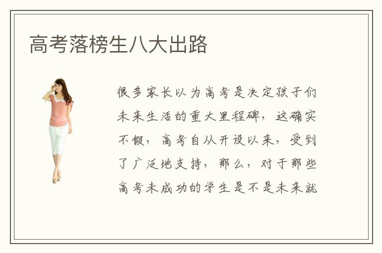 很多家长以为高考是决定孩子们未来生活的重大里程碑,这确实不假,高考自从开设以来,受到了广泛地支持,那么,对于那些高考未成功的学生是不是未来就前途渺茫了呢?其实不然,要明白高考落榜生还有八大出路。高考落榜生八大出路具体是有哪些?高考落榜后可以选择出国深造,或者还可以进入到专业的培训机构学习等等。那么,高考落榜生八大出路如何选择呢?