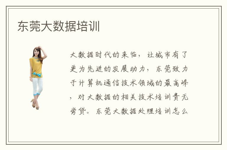 大数据时代的来临,让城市有了更为先进的发展动力,东莞致力于计算机通信技术领域的最高峰,对大数据的相关技术培训责无旁贷。东莞大数据处理培训怎么样?东莞大数据培训是专业的、高质量的、高水准的,东莞大数据培训主要的方向是拓宽学生视野、保持创新思维、加强思维逻辑性。东莞大数据培训学校机构有哪些?东莞大数据处理专业而全面。