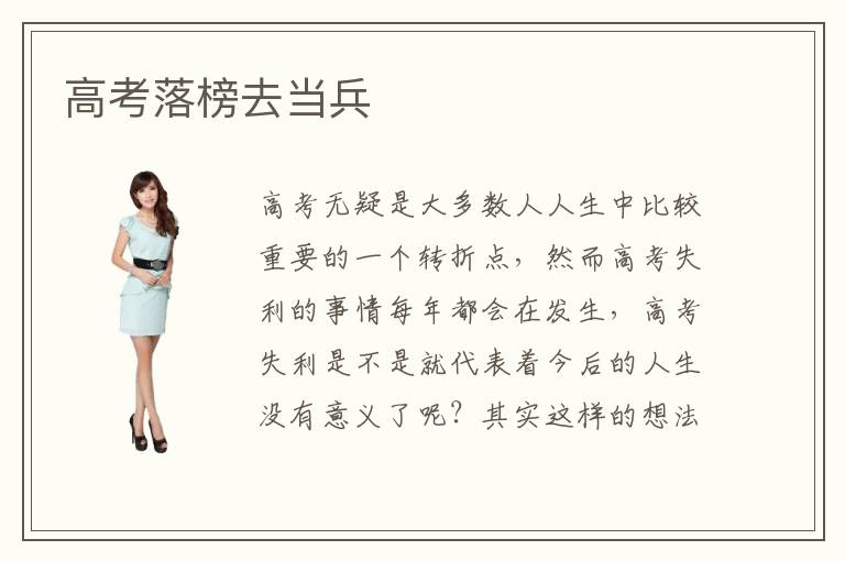 高考无疑是大多数人人生中比较重要的一个转折点,然而高考失利的事情每年都会在发生,高考失利是不是就代表着今后的人生没有意义了呢?其实这样的想法是不正确的,高考失利后能做的事情有很多,重点是要有一颗为自己今后就业负责的心。高考落榜去当兵就是其中一条出路,当兵可以磨练自己的意志,退伍之后对自己的找工作也是很有帮助的,因此高考落榜去当兵这个建议可以考虑。
