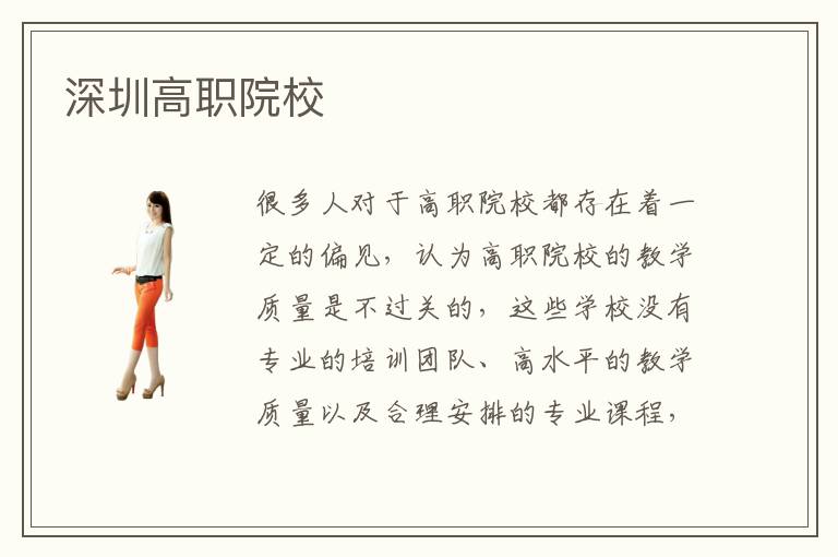 很多人对于高职院校都存在着一定的偏见,认为高职院校的教学质量是不过关的,这些学校没有专业的培训团队、高水平的教学质量以及合理安排的专业课程,对于专业技术的学习是没有帮助的。然而这种说法并不在绝对的,也有些职业学院的教学是很靠谱的。深圳高职院校成立多年通过自身的教学实力,充分证明了高职院校也是有靠谱的,也为深圳高职院校赢得了良好的口碑。