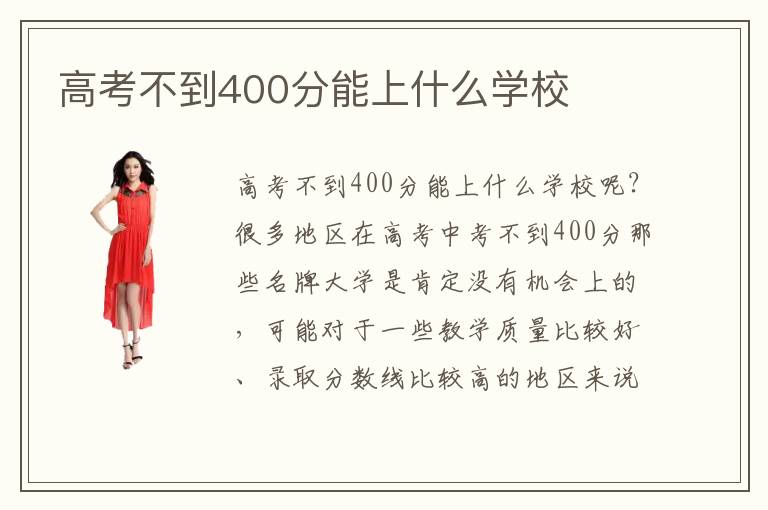 高考不到400分能上什么学校呢?很多地区在高考中考不到400分那些名牌大学是肯定没有机会上的,可能对于一些教学质量比较好、录取分数线比较高的地区来说,高考没有400分的同学都不能去上一所大学。掌握好一门具有发展前途的专业技术才是更好立足于社会的根本,考不上好大学的同学可以考虑一些以技术专业化教学为主的培训机构,这些培训机构的教学方式相对来说也更适合大家。