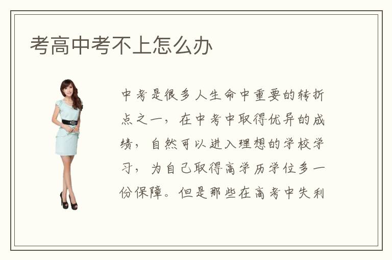 中考是很多人生命中重要的转折点之一,在中考中取得优异的成绩,自然可以进入理想的学校学习,为自己取得高学历学位多一份保障。但是那些在高考中失利的同学也不要对今后当然生活失去信心,下面我就来告诉大家考高中考不上怎么办吧。现在很多企业对于学位并不是特别看中,只要你掌握了高水平的专业技术,是企业急需的技术型人才,我想大多数企业还是会选择录取的,所以最重要的还是看自己的专业技术掌握水平。