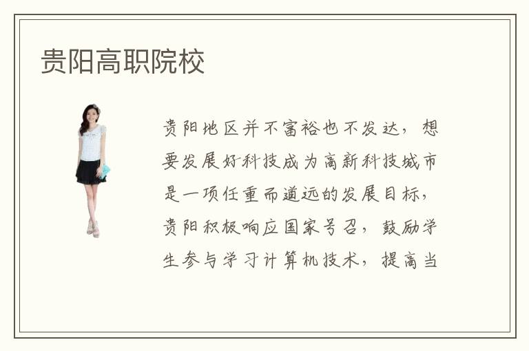 贵阳地区并不富裕也不发达,想要发展好科技成为高新科技城市是一项任重而道远的发展目标,贵阳积极响应国家号召,鼓励学生参与学习计算机技术,提高当地群众的平均科技实力。贵阳高职院校的成立也是为了能够多一些学生投入社会生产。贵阳高职学校以计算机技术为基准展开教育、教学。贵阳高职职业技术培训学校哪家强?可以参考群众对贵阳高职院校一些推荐。