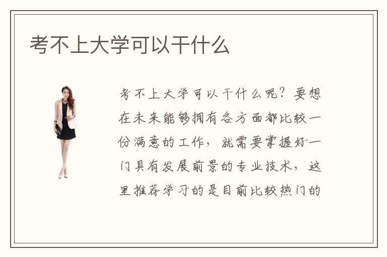 考不上大学可以干什么呢?要想在未来能够拥有各方面都比较一份满意的工作,就需要掌握好一门具有发展前景的专业技术,这里推荐学习的是目前比较热门的一些计算机专业,例如JAVA语言编程设计以及web网站前端设计专业等等。考不上大学的同学可以选择去一些专业技术培训学校学习相关专业,相信通过专业化的教学培训以及自己的努力,一定可以很好的完成计算机相关专业的学习。