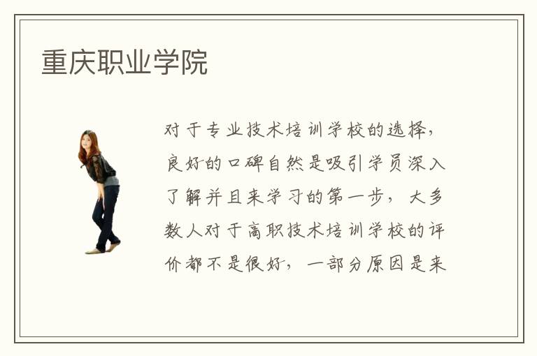 对于专业技术培训学校的选择,良好的口碑自然是吸引学员深入了解并且来学习的第一步,大多数人对于高职技术培训学校的评价都不是很好,一部分原因是来自于大多数高职院校的专业课程教学质量不够好,另一部分则是来自于大家对于高职院校日积月累的偏见。当然还是存在着不少教学水平高的高职院校的,那么你知道重庆职业学院中哪些高职院校的口碑比较好呢?