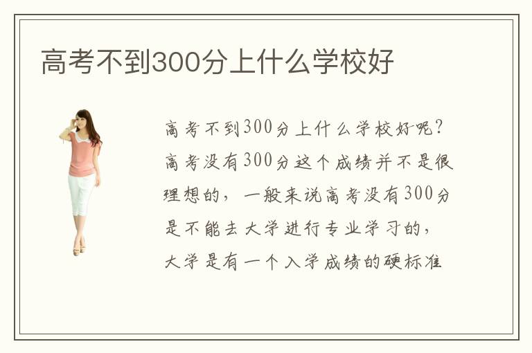 高考不到300分上什么学校好呢?高考没有300分这个成绩并不是很理想的,一般来说高考没有300分是不能去大学进行专业学习的,大学是有一个入学成绩的硬标准的,因此高考不到300分也就不能上大学了。那么,高考不到300分上什么学校好呢?现在有很多大专技术培训学校成立起来,这些大专技术培训学校通常是高考落榜学生们进行专业学习的平台,因此高考不到300分可以上大专。