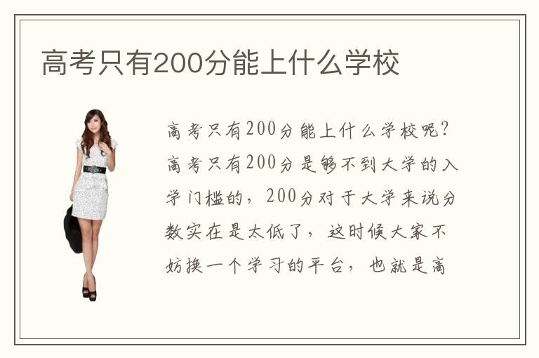 高考只有200分能上什么学校呢?高考只有200分是够不到大学的入学门槛的,200分对于大学来说分数实在是太低了,这时候大家不妨换一个学习的平台,也就是高考只有200分的同学可以选择一些专业技术大专学校进行学习,只要选好一门具有广阔发展前景的专业技术,再加上大专技术学院的专业化教学以及自身的努力,还是可以凭借这条道路为自己赢得更美好的未来。