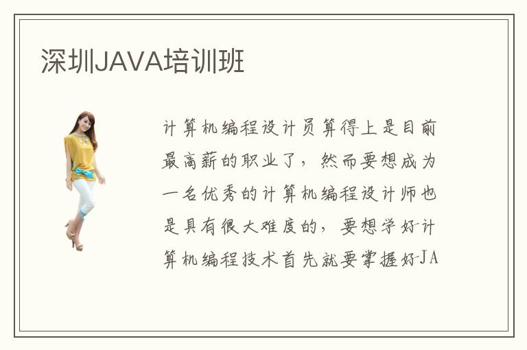 计算机编程设计员算得上是目前最高薪的职业了,然而要想成为一名优秀的计算机编程设计师也是具有很大难度的,要想学好计算机编程技术首先就要掌握好JAVA语言编程设计技术,总的来说JAVA语言的就业前景还是很广阔的。那么怎样才能又快又好的学会JAVA语言编程设计呢?深圳JAVA培训班是大家学习JAVA的靠谱平台,想要成为计算机编程设计师的同学可以考虑一下深圳JAVA培训班。