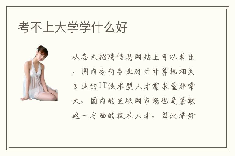从各大招聘信息网站上可以看出,国内各行各业对于计算机相关专业的IT技术型人才需求量非常大,国内的互联网市场也是紧缺这一方面的技术人才,因此学好计算机相关专业在国内的发展前景还是很广阔的。考不上大学学什么专业比较好呢?从国内信息化趋势的发展来看,学好计算机相关专业还是很有必要的,因此考不上大学的同学学习计算机专业可以更好的保障自己未来的就业。