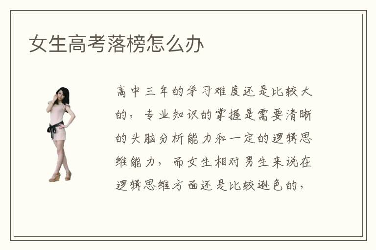 高中三年的学习难度还是比较大的,专业知识的掌握是需要清晰的头脑分析能力和一定的逻辑思维能力,而女生相对男生来说在逻辑思维方面还是比较逊色的,因此高中三年的学习对于女生们来说还是比较辛苦的。高中落榜的成员中女生的比例是要高于男生比例的,那么女生高考落榜怎么办呢?女生们比较有锁的还是他们的审美,现在有很多比较具有发展前景的美术设计专业,高考落榜的女生可以选择这些专业进行学习。