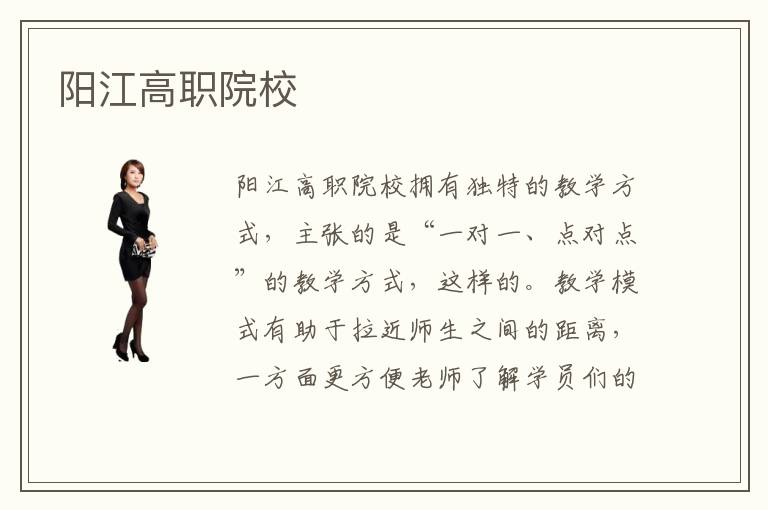阳江高职院校拥有独特的教学方式,主张的是“一对一、点对点”的教学方式,这样的。教学模式有助于拉近师生之间的距离,一方面更方便老师了解学员们的专业掌握情况,并且根据学员们的学习进度安排相应的专业课程,另一方面也方便学员们向老师提出问题,并且有足够的时间和精力去深入解决这些问题,这样高效的教学模式一定可以让学员们的专业技术学习效果最大化。