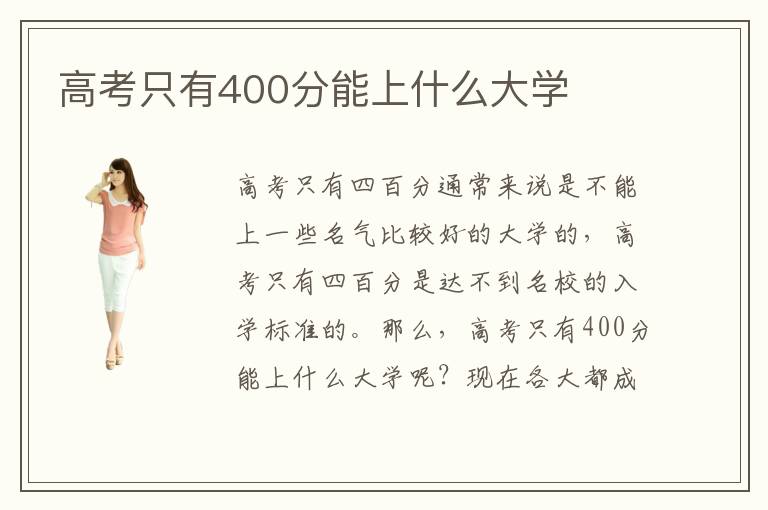 高考只有四百分通常来说是不能上一些名气比较好的大学的,高考只有四百分是达不到名校的入学标准的。那么,高考只有400分能上什么大学呢?现在各大都成立了很多大专技术培训学校,是特地为这些考不上大学的挑选准备的一个以专业技术培训为重点的平台,在各种大专技术学院中同学们可以根据自己的实际情况以及未来就业形势进行专业技术学习的参考。