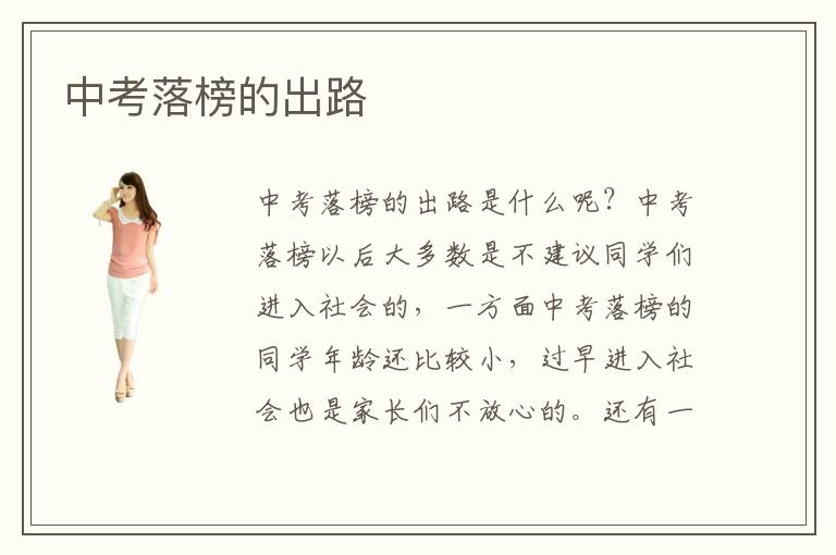 中考落榜的出路是什么呢?中考落榜以后大多数是不建议同学们进入社会的,一方面中考落榜的同学年龄还比较小,过早进入社会也是家长们不放心的。还有一个方面就是中考落榜的同学由于经验的不足,在并没有很好掌握一门专业技术的情况下是不能立足于社会的。因此也就说明了中考落榜的出路首先就是要找到一门适合自己,并且具有广阔发展前景的专业去努力学习它。
