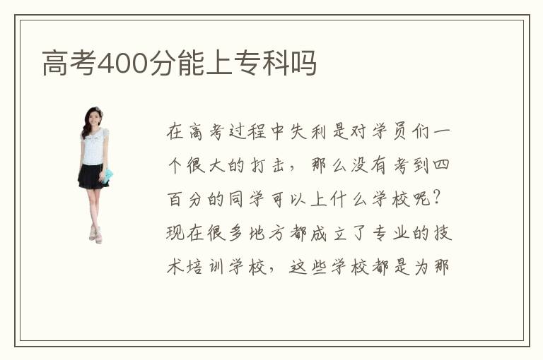 在高考过程中失利是对学员们一个很大的打击,那么没有考到四百分的同学可以上什么学校呢?现在很多地方都成立了专业的技术培训学校,这些学校都是为那些没有考上大学的同学进行专业学习而准备的。那么,高考400分能上专科吗?专业技术培训学校的成立对于大多数同学来说都是很有必要的,这些专业技术培训学校的教学对于同学们的成绩要求并不是很高,因此高考400分是能上专科的。